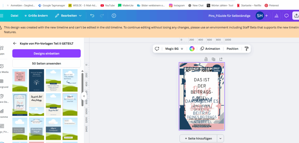 Am Anfang dachte ich noch, ich mache irgendwas falsch (das „technisches Embryo“ hat wieder zugeschlagen😂). Ich arbeite mit Vorlagen für meine Pin-Designs, damit ich nicht jedes Mal von vorne anfangen muss. Normalerweise öffne ich das Design, lade meine Vorlagen rein und habe in einem Rutsch 50 Pin-Vorlagen, in die ich nur noch die Texte einfügen muss.